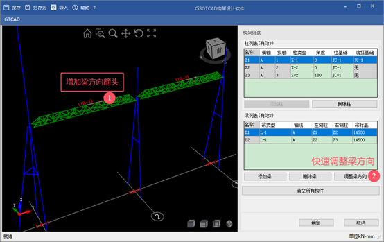 e) 視圖中增加梁方向顯示箭頭,梁組裝頁(yè)面增加“調(diào)整梁方向”按鈕