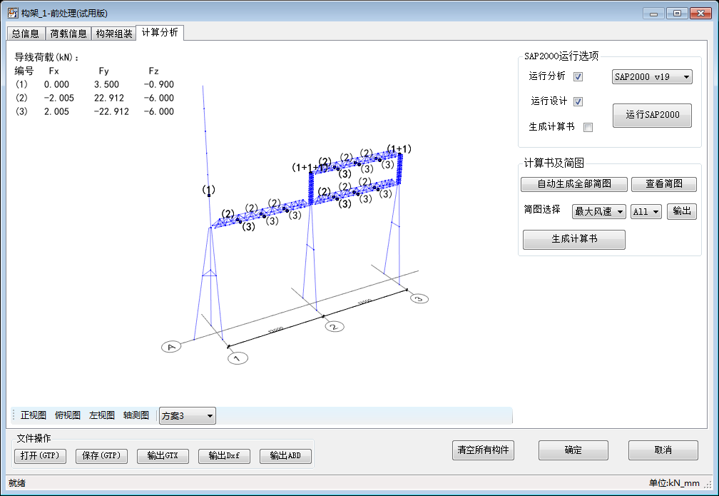 老版本的GT模型數(shù)據(jù)需要在建模對(duì)話框中導(dǎo)出“GTP”文件,再通過(guò)“導(dǎo)入”菜單導(dǎo)入到新的GT版本中。由于新舊版本數(shù)據(jù)合適有很大差異,模型導(dǎo)入后用戶應(yīng)檢查模型數(shù)據(jù)是否正確,導(dǎo)線荷載需要從新布置