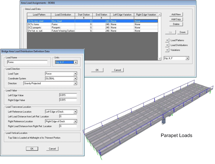 可以用任意定義的荷載樣式指定橋梁對象荷載,可以包括表面覆蓋、欄桿、格柵、隔板、主梁、橋面板等引起的荷載。