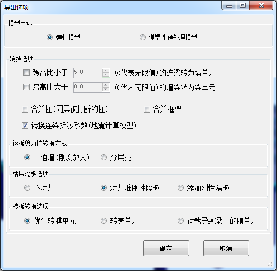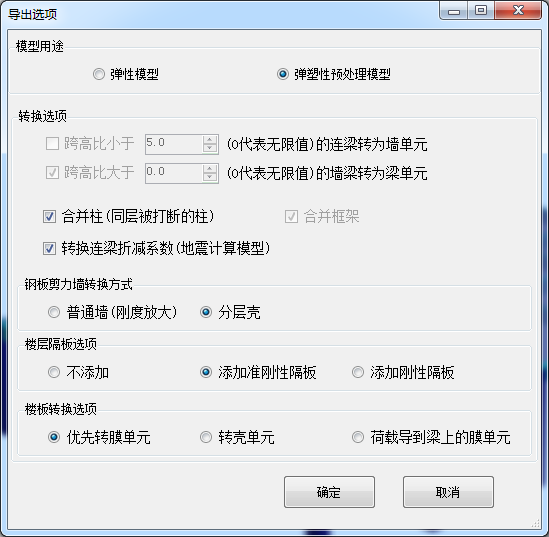 - 導(dǎo)入PKPM和YJK模型時不再顯示選項(xiàng)對話框,改為導(dǎo)出模型時彈出選項(xiàng)對話框;模型用途可選彈性模型和彈塑性預(yù)處理模型;