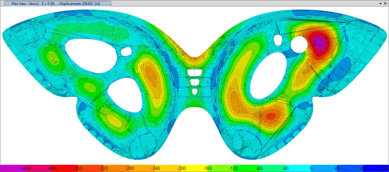 分析模型視圖顯示結構的有限元模型,該模型由連通的節(jié)點、框架單元、殼單元以及定義的網(wǎng)格劃分組成。運行分析時,程序根據(jù)模型的指定和設置自動生成分析模型。
