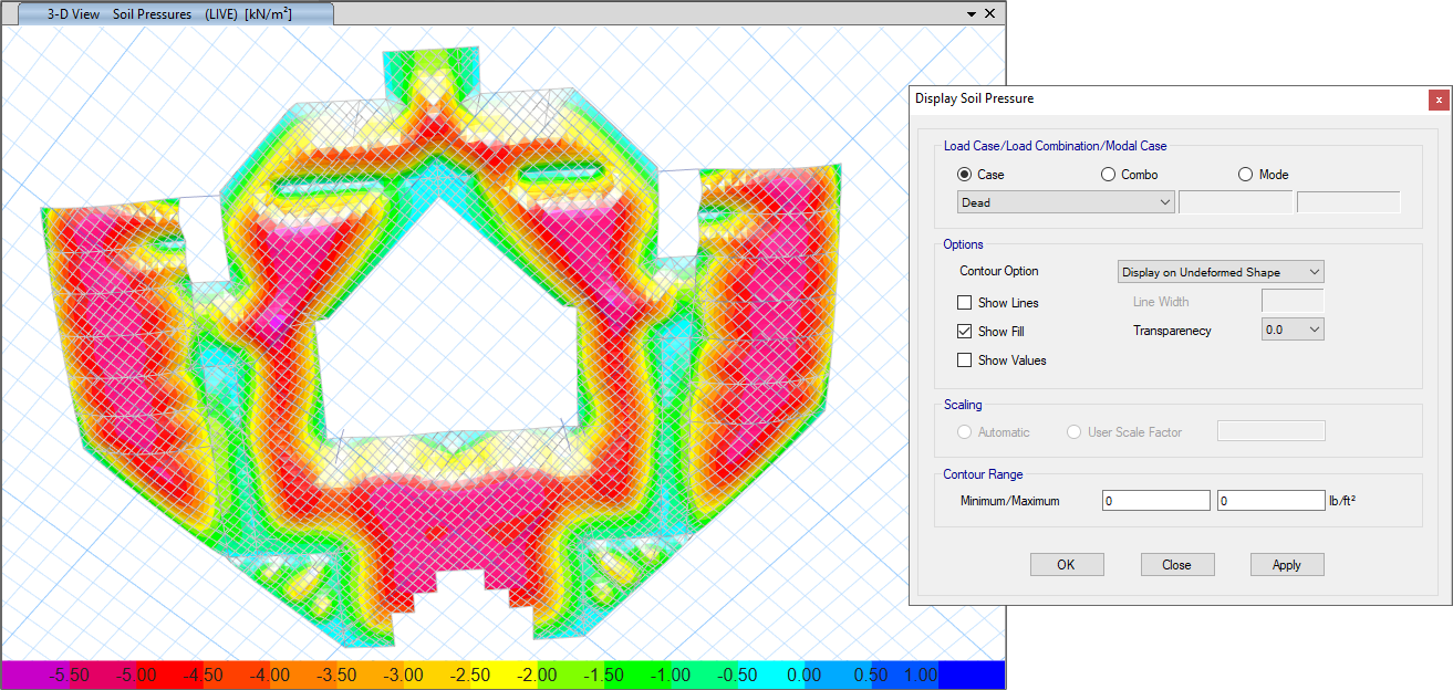 在2D或3D視圖中顯示特定荷載工況或荷載組合下殼單元的內(nèi)力、彎矩、剪力和應(yīng)力云圖。