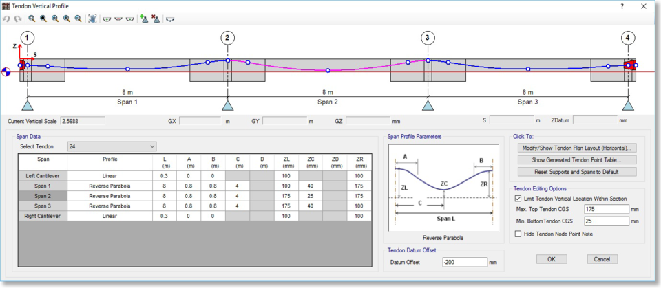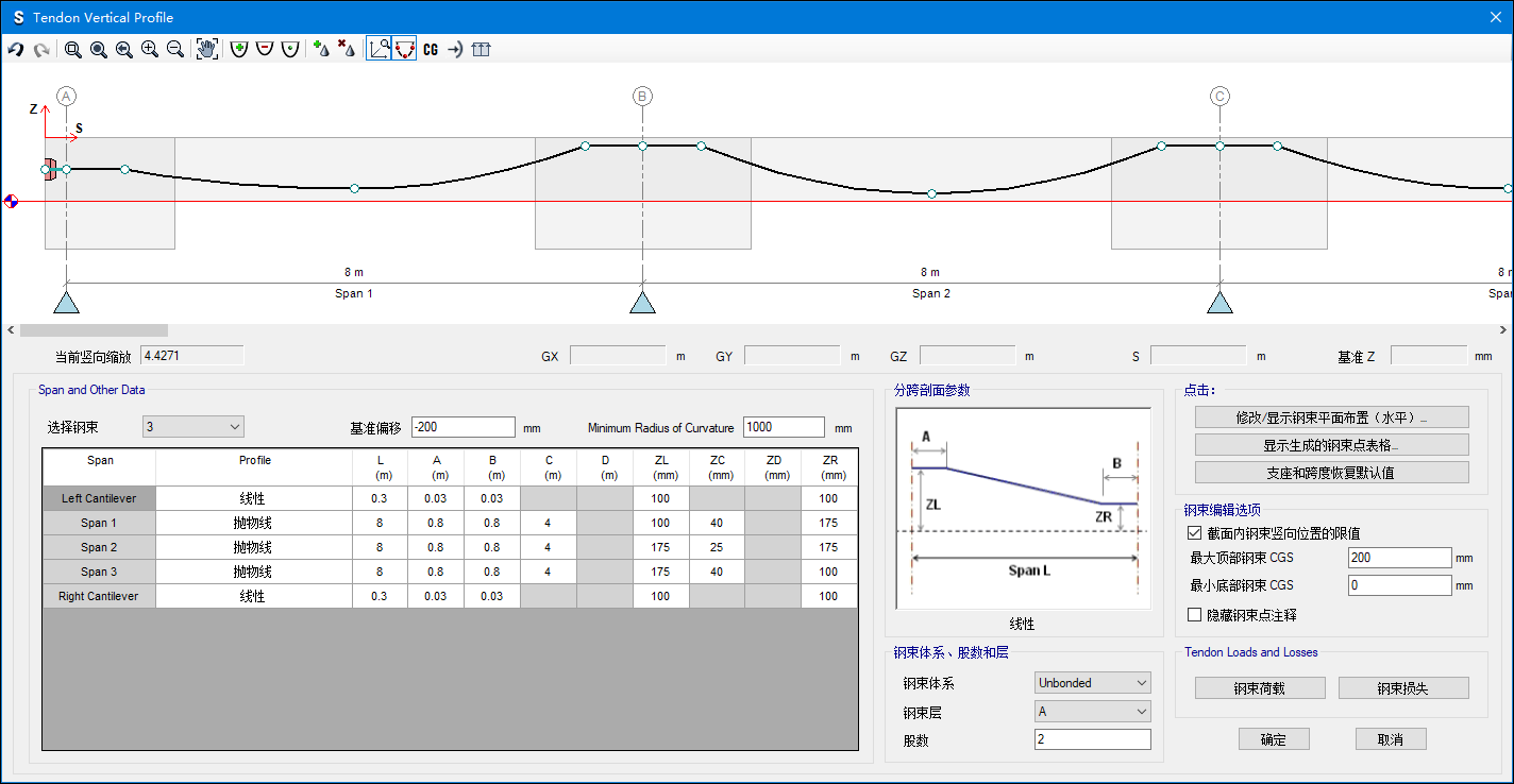 - 后張預(yù)應(yīng)力鋼束縱向剖面對(duì)話框中的可編輯信息得到進(jìn)一步擴(kuò)展,包括鋼束剖面、鋼束幾何、鋼束荷載、鋼束損失以及荷載平衡等