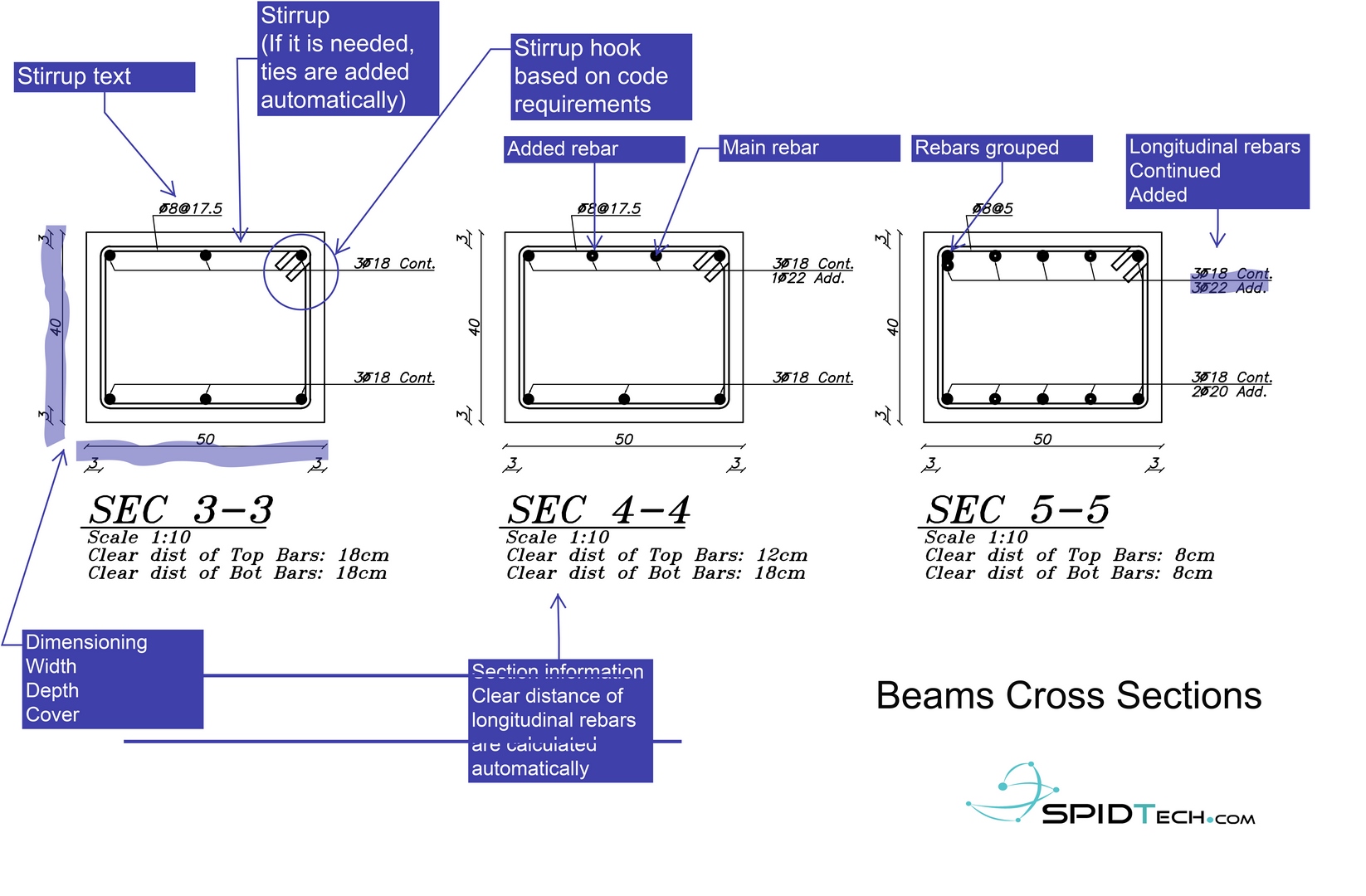 梁的縱斷面有重要的結構信息。包括主筋,附加鋼筋,梁不同區(qū)域的箍筋,橫截面,橫梁,柱和柱尺寸。此外,縱斷面包括基于規(guī)范要求的搭接,材料表中的鋼筋編號,尺寸和軸線,基于規(guī)范要求的彎鉤,梁定位布局,基于規(guī)范要求的警告和建議等等。