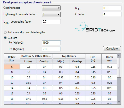 根據(jù)用戶設(shè)置和ACI規(guī)定,計算并詳細顯示搭接,粘結(jié)和彎鉤長度值。您可以手動或自動設(shè)置頂部鋼筋和底部鋼筋的延伸長度(Ld),彎起延伸長度(Ldh),重疊長度和彎鉤長度。