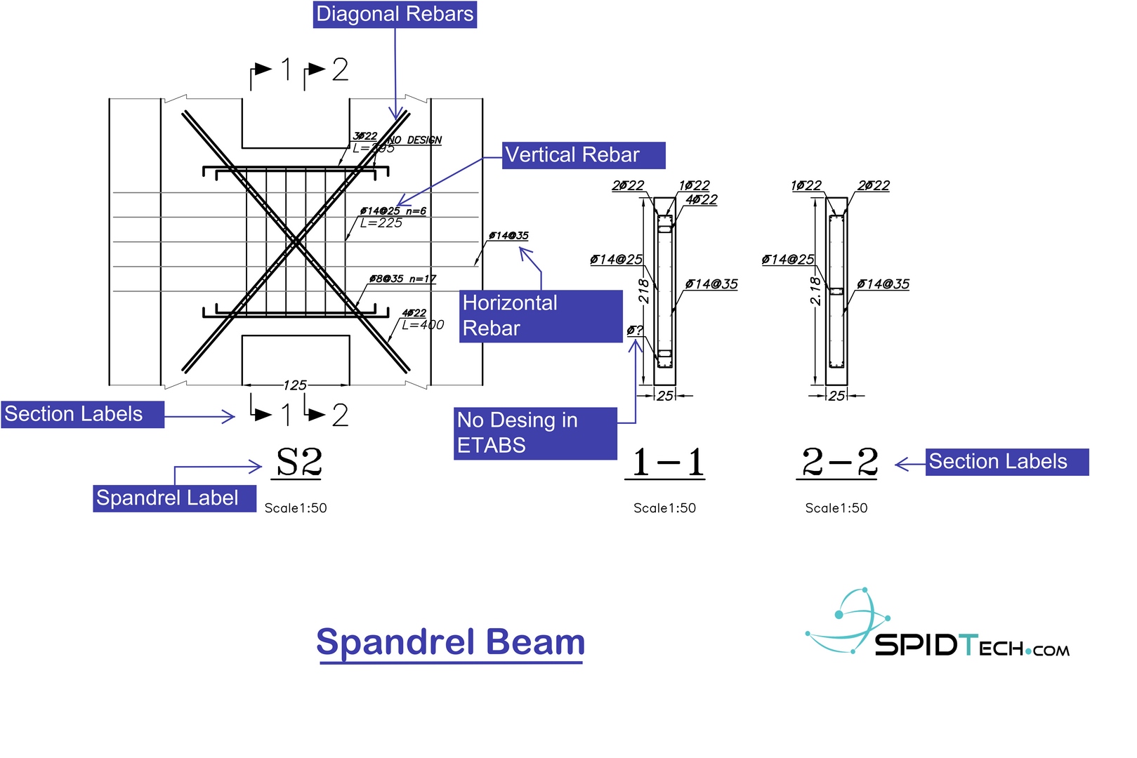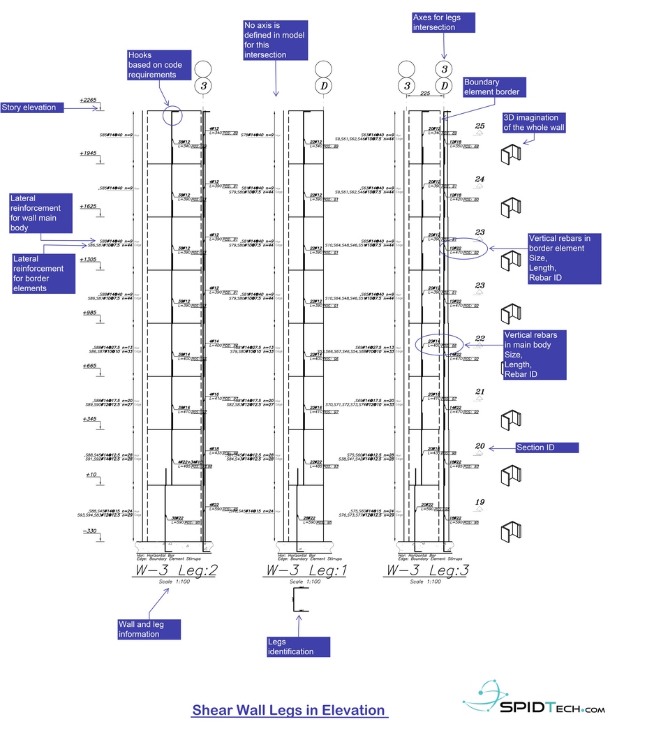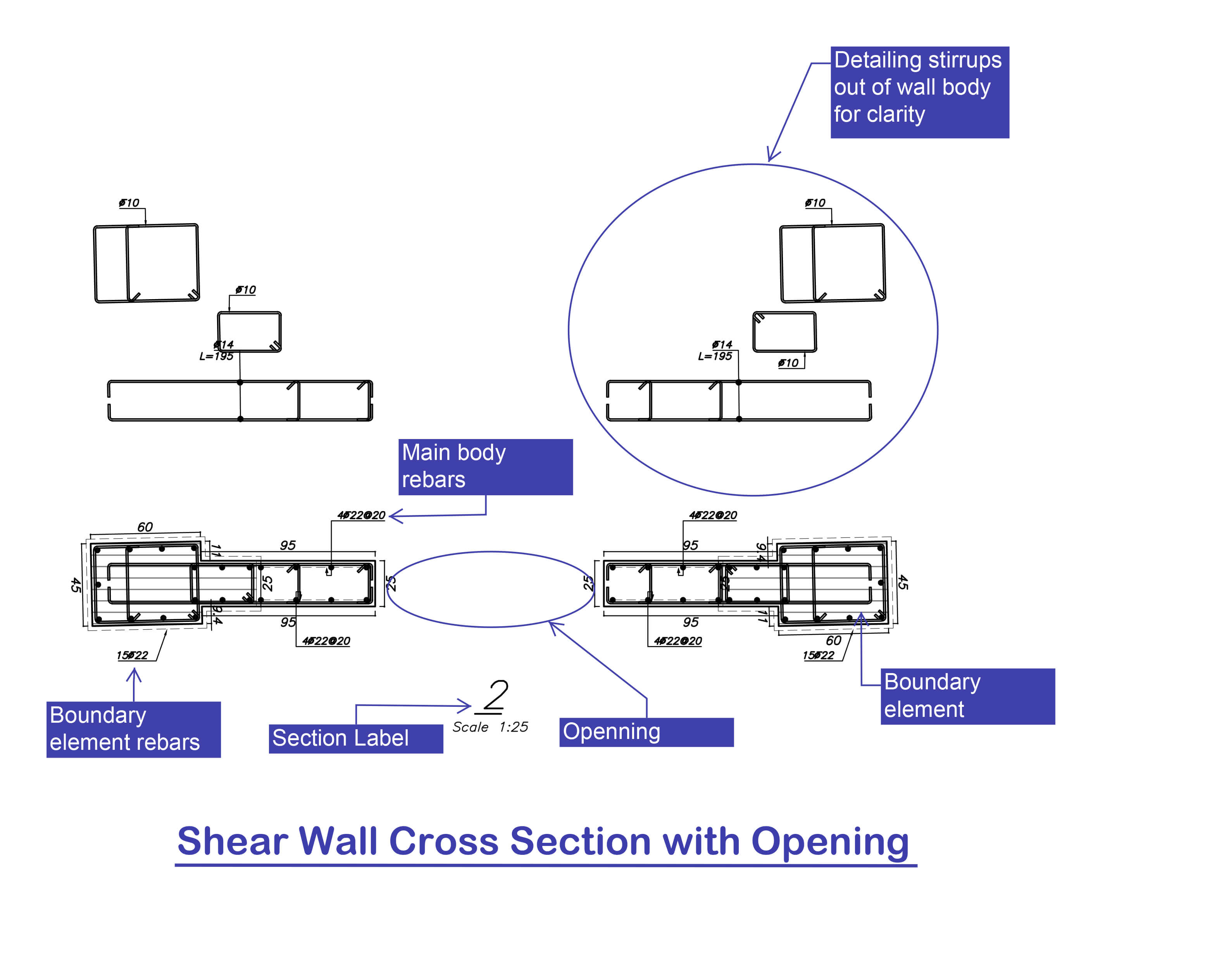 根據(jù)剪力墻立面的詳細信息,可以獲得墻任何位置的橫截面。這些截面顯示了墻的縱向和橫向鋼筋。在配筋方面,SPIDER截面也顯示了邊緣構(gòu)件的配筋。截面幾何、開洞、尺寸、保護層和比例是在剪力墻截面上顯示的其他結(jié)構(gòu)數(shù)據(jù)。此外,為了清楚起見,在橫截面之外詳細繪制了箍筋。